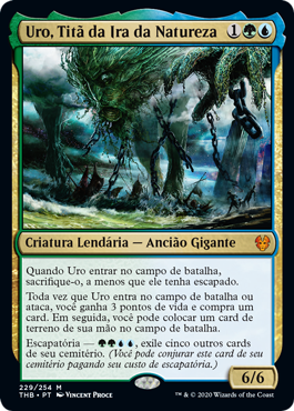 | Rules | When Uro enters the battlefield, sacrifice it unless it escaped. Whenever Uro enters the battlefield or attacks, you gain 3 life and draw a card, then you may put a land card from your hand onto the battlefield. Escape—, Exile five other cards from your graveyard. (You may cast this card from your graveyard for its escape cost.) |