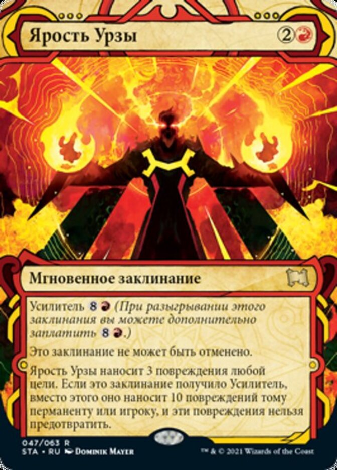 | Rules | Kicker (You may pay an additional as you cast this spell.) This spell can't be countered. Urza's Rage deals 3 damage to any target. If this spell was kicked, instead it deals 10 damage to that permanent or player and the damage can't be prevented. |