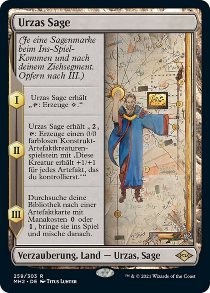 | Rules | (As this Saga enters and after your draw step, add a lore counter. Sacrifice after III.) I — Urza's Saga gains ": Add ." II — Urza's Saga gains ", : Create a 0/0 colorless Construct artifact creature token with 'This creature gets +1/+1 for each artifact you control.'" III — Search your library for an artifact card with mana cost or , put it onto the battlefield, then shuffle. |