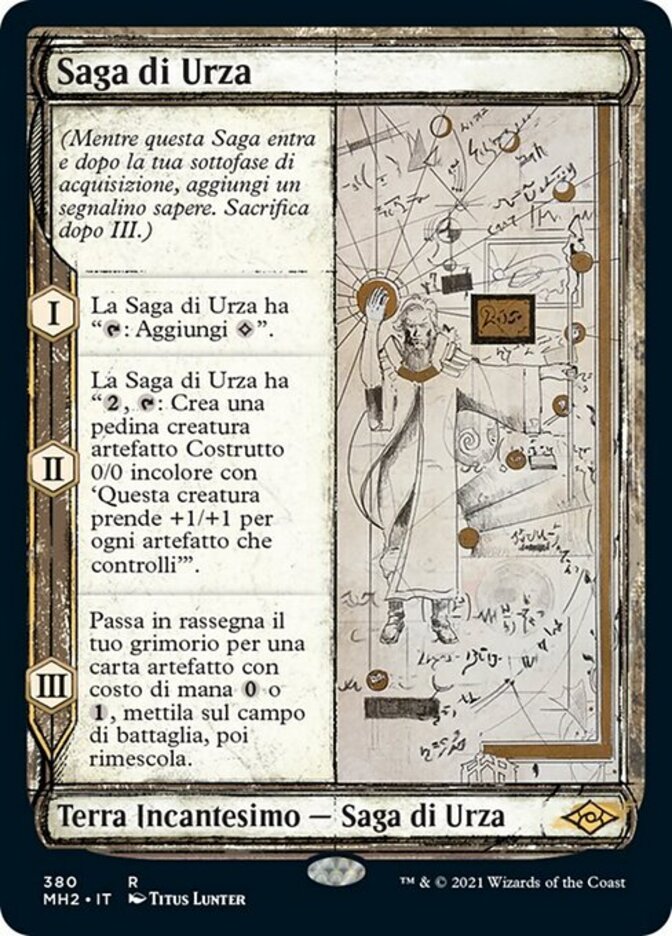 | Rules | (As this Saga enters and after your draw step, add a lore counter. Sacrifice after III.) I — Urza's Saga gains ": Add ." II — Urza's Saga gains ", : Create a 0/0 colorless Construct artifact creature token with 'This creature gets +1/+1 for each artifact you control.'" III — Search your library for an artifact card with mana cost or , put it onto the battlefield, then shuffle. |