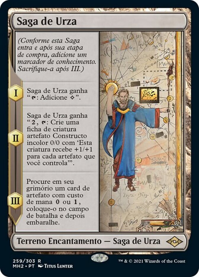 | Rules | (As this Saga enters and after your draw step, add a lore counter. Sacrifice after III.) I — Urza's Saga gains ": Add ." II — Urza's Saga gains ", : Create a 0/0 colorless Construct artifact creature token with 'This creature gets +1/+1 for each artifact you control.'" III — Search your library for an artifact card with mana cost or , put it onto the battlefield, then shuffle. |