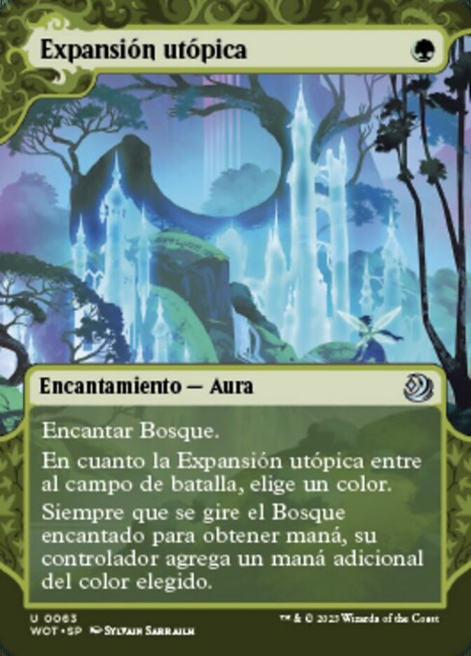 | Rules | Enchant Forest As Utopia Sprawl enters the battlefield, choose a color. Whenever enchanted Forest is tapped for mana, its controller adds an additional one mana of the chosen color. |