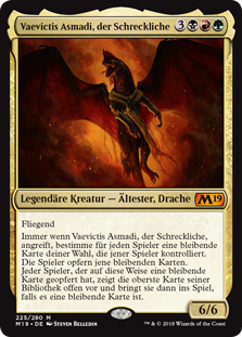 | Rules | Flying Whenever Vaevictis Asmadi, the Dire attacks, for each player, choose target permanent that player controls. Those players sacrifice those permanents. Each player who sacrificed a permanent this way reveals the top card of their library, then puts it onto the battlefield if it's a permanent card. |