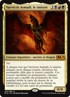 | Rules | Flying Whenever Vaevictis Asmadi, the Dire attacks, for each player, choose target permanent that player controls. Those players sacrifice those permanents. Each player who sacrificed a permanent this way reveals the top card of their library, then puts it onto the battlefield if it's a permanent card. |