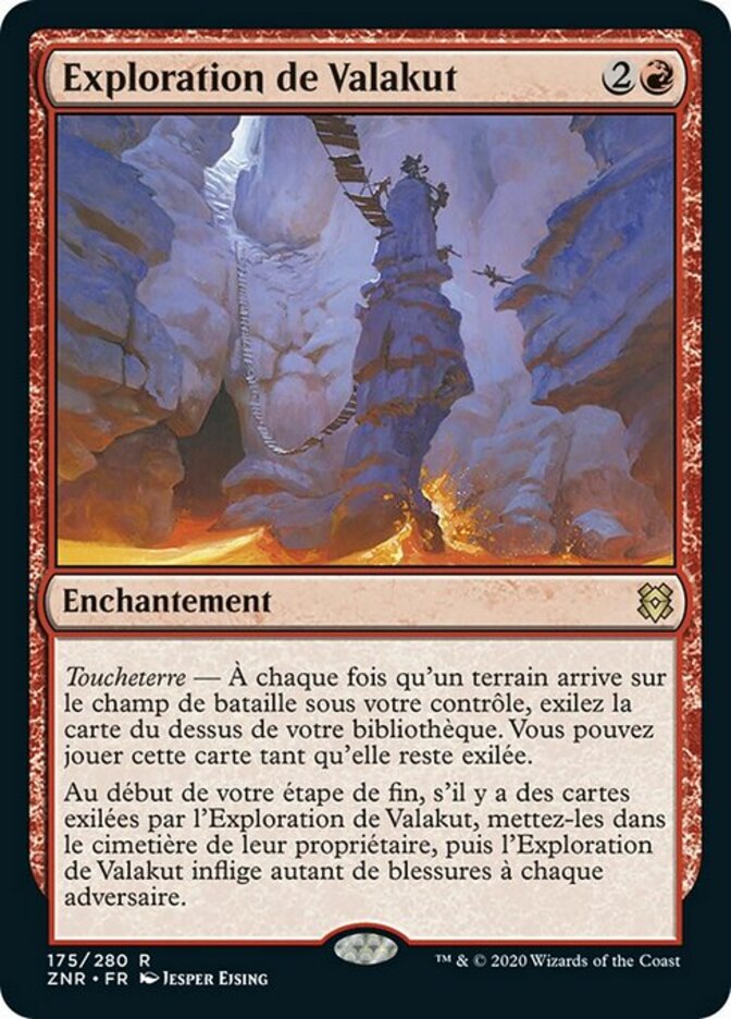| Rules | Landfall — Whenever a land enters the battlefield under your control, exile the top card of your library. You may play that card for as long as it remains exiled. At the beginning of your end step, if there are cards exiled with Valakut Exploration, put them into their owner's graveyard, then Valakut Exploration deals that much damage to each opponent. |
