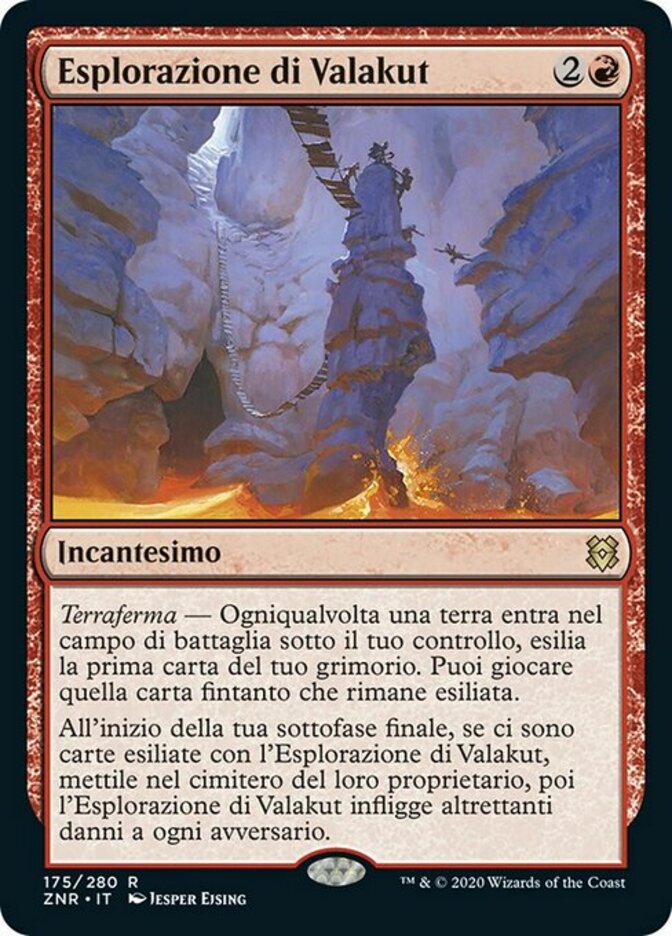 | Rules | Landfall — Whenever a land enters the battlefield under your control, exile the top card of your library. You may play that card for as long as it remains exiled. At the beginning of your end step, if there are cards exiled with Valakut Exploration, put them into their owner's graveyard, then Valakut Exploration deals that much damage to each opponent. |