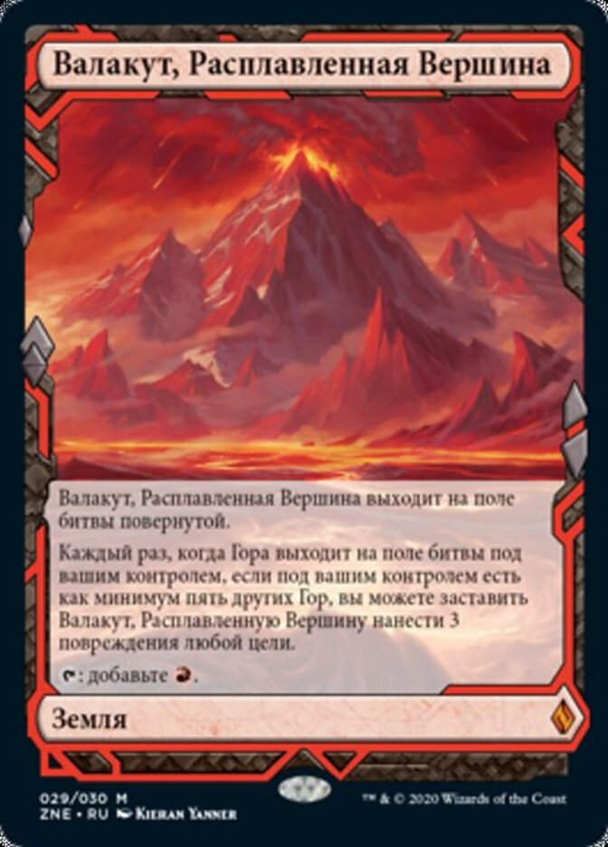 | Rules | Valakut, the Molten Pinnacle enters the battlefield tapped. Whenever a Mountain enters the battlefield under your control, if you control at least five other Mountains, you may have Valakut, the Molten Pinnacle deal 3 damage to any target. : Add . |