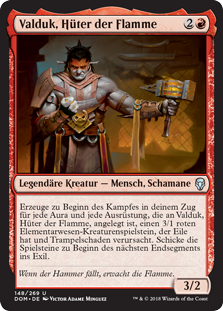 | Rules | At the beginning of combat on your turn, for each Aura and Equipment attached to Valduk, Keeper of the Flame, create a 3/1 red Elemental creature token with trample and haste. Exile those tokens at the beginning of the next end step. |
