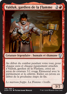 | Rules | At the beginning of combat on your turn, for each Aura and Equipment attached to Valduk, Keeper of the Flame, create a 3/1 red Elemental creature token with trample and haste. Exile those tokens at the beginning of the next end step. |