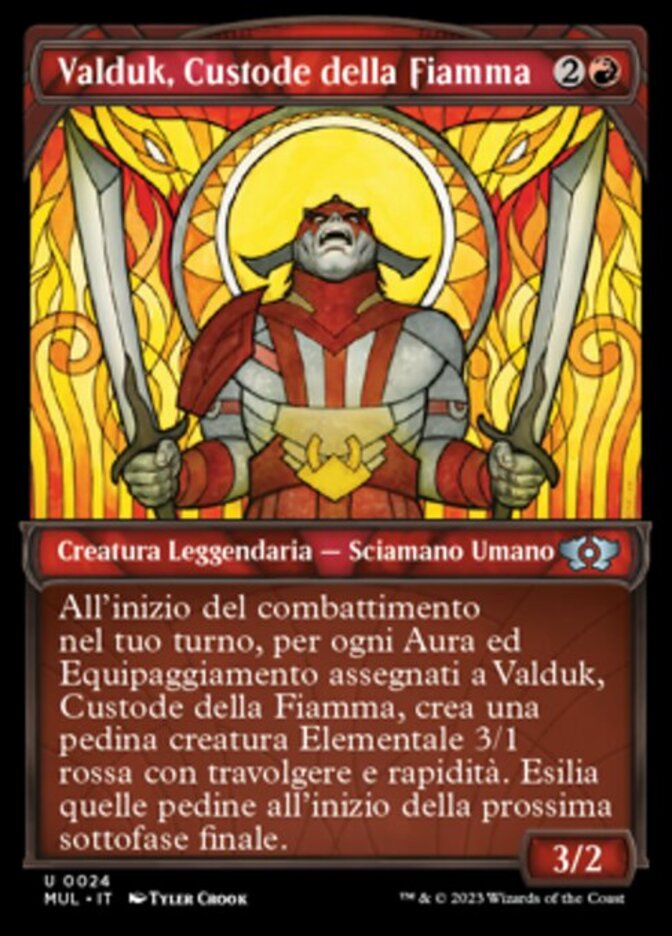 | Rules | At the beginning of combat on your turn, for each Aura and Equipment attached to Valduk, Keeper of the Flame, create a 3/1 red Elemental creature token with trample and haste. Exile those tokens at the beginning of the next end step. |