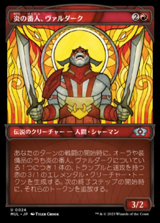 | Rules | At the beginning of combat on your turn, for each Aura and Equipment attached to Valduk, Keeper of the Flame, create a 3/1 red Elemental creature token with trample and haste. Exile those tokens at the beginning of the next end step. |