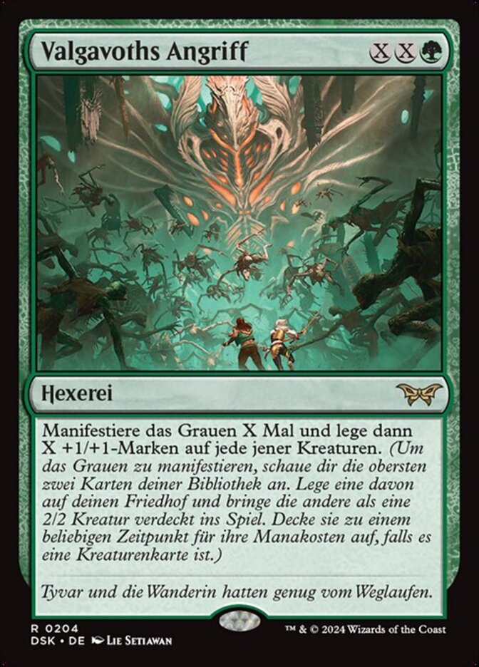 | Rules | Manifest dread X times, then put X +1/+1 counters on each of those creatures. (To manifest dread, look at the top two cards of your library, then put one onto the battlefield face down as a 2/2 creature and the other into your graveyard. Turn it face up any time for its mana cost if it's a creature card.) |