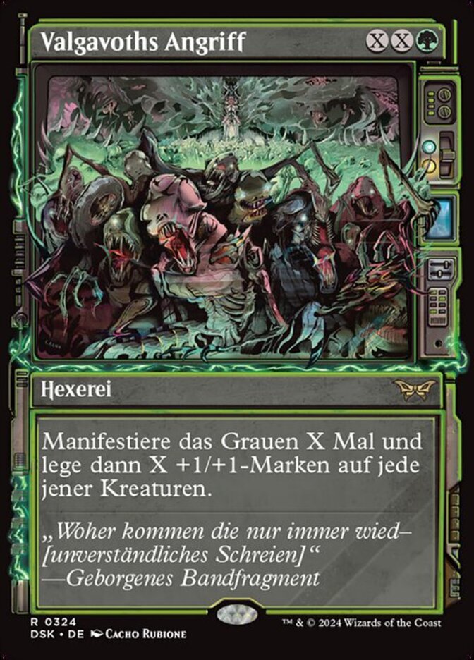 | Rules | Manifest dread X times, then put X +1/+1 counters on each of those creatures. (To manifest dread, look at the top two cards of your library, then put one onto the battlefield face down as a 2/2 creature and the other into your graveyard. Turn it face up any time for its mana cost if it's a creature card.) |