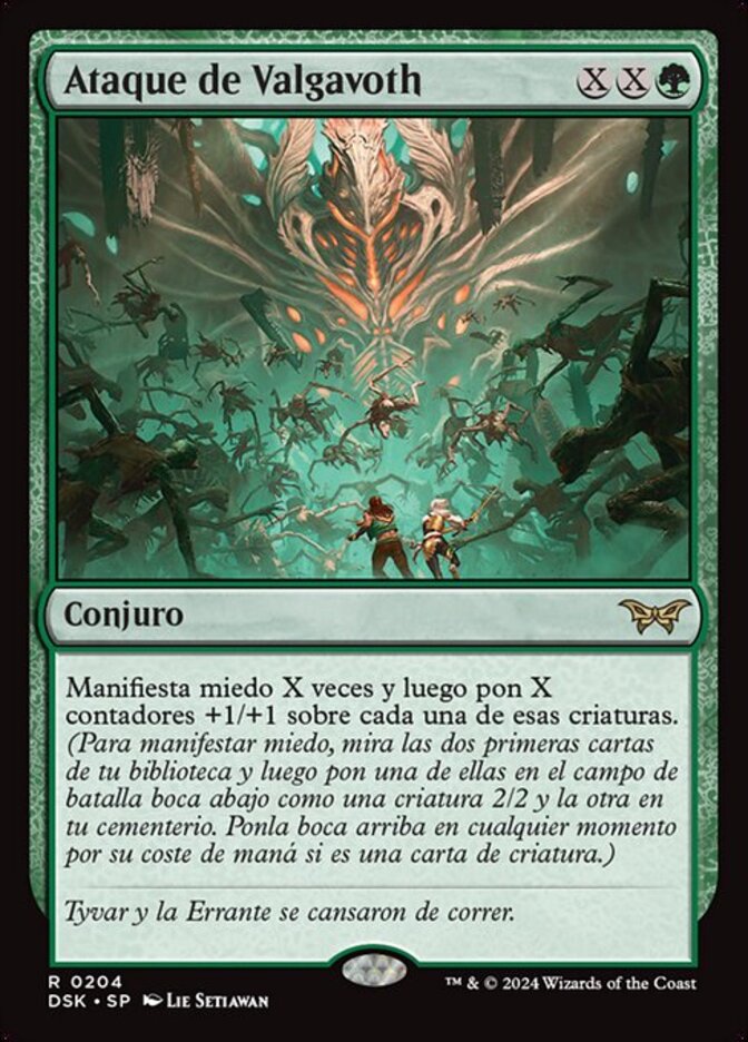 | Rules | Manifest dread X times, then put X +1/+1 counters on each of those creatures. (To manifest dread, look at the top two cards of your library, then put one onto the battlefield face down as a 2/2 creature and the other into your graveyard. Turn it face up any time for its mana cost if it's a creature card.) |
