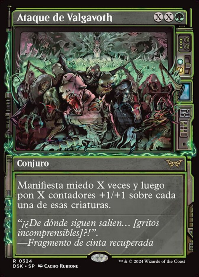 | Rules | Manifest dread X times, then put X +1/+1 counters on each of those creatures. (To manifest dread, look at the top two cards of your library, then put one onto the battlefield face down as a 2/2 creature and the other into your graveyard. Turn it face up any time for its mana cost if it's a creature card.) |