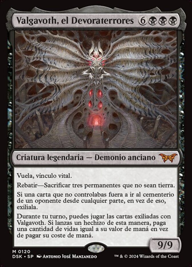 | Rules | Flying, lifelink Ward—Sacrifice three nonland permanents. If a card you didn't control would be put into an opponent's graveyard from anywhere, exile it instead. During your turn, you may play cards exiled with Valgavoth. If you cast a spell this way, pay life equal to its mana value rather than pay its mana cost. |