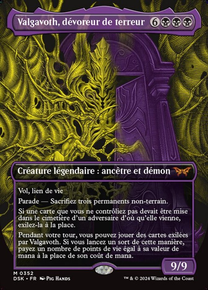 | Rules | Flying, lifelink Ward—Sacrifice three nonland permanents. If a card you didn't control would be put into an opponent's graveyard from anywhere, exile it instead. During your turn, you may play cards exiled with Valgavoth. If you cast a spell this way, pay life equal to its mana value rather than pay its mana cost. |
