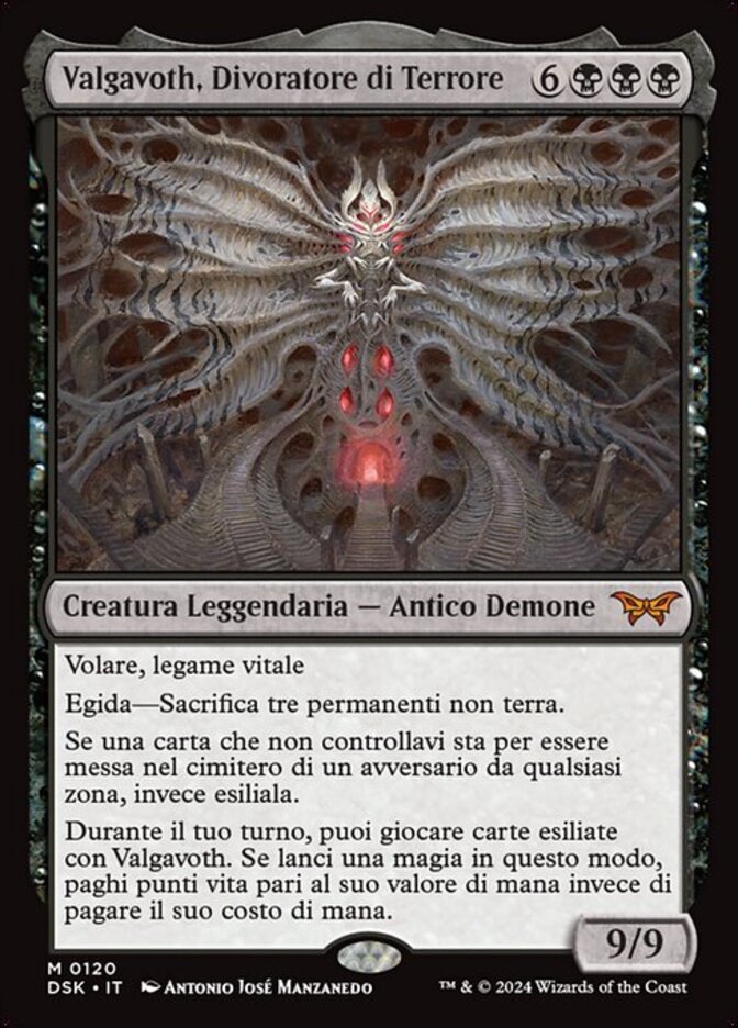 | Rules | Flying, lifelink Ward—Sacrifice three nonland permanents. If a card you didn't control would be put into an opponent's graveyard from anywhere, exile it instead. During your turn, you may play cards exiled with Valgavoth. If you cast a spell this way, pay life equal to its mana value rather than pay its mana cost. |