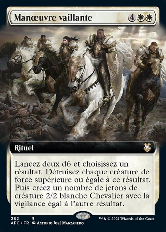 | Rules | Roll two d6 and choose one result. Destroy each creature with power greater than or equal to that result. Then create a number of 2/2 white Knight creature tokens with vigilance equal to the other result. |