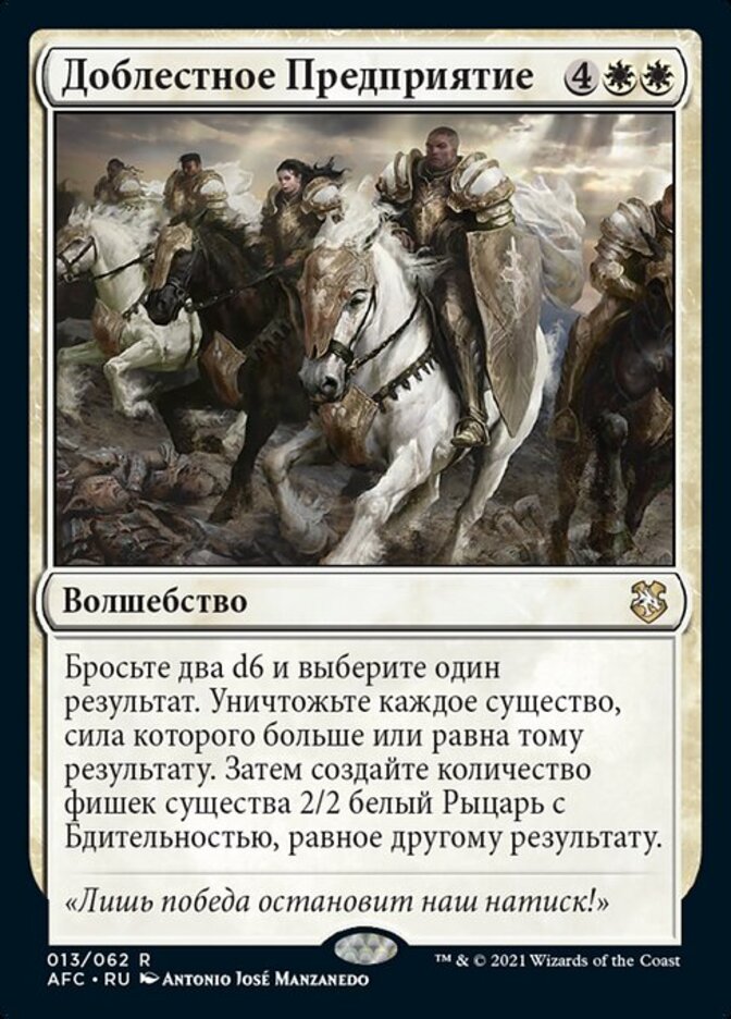 | Rules | Roll two d6 and choose one result. Destroy each creature with power greater than or equal to that result. Then create a number of 2/2 white Knight creature tokens with vigilance equal to the other result. |