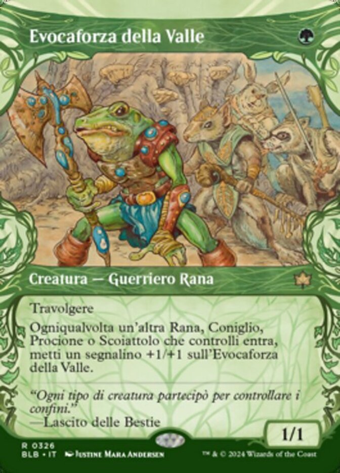 | Rules | Trample Whenever another Frog, Rabbit, Raccoon, or Squirrel you control enters, put a +1/+1 counter on Valley Mightcaller. |