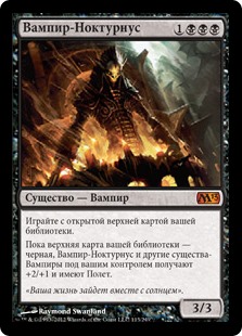 | Rules | Play with the top card of your library revealed. As long as the top card of your library is black, Vampire Nocturnus and other Vampire creatures you control get +2/+1 and have flying. |