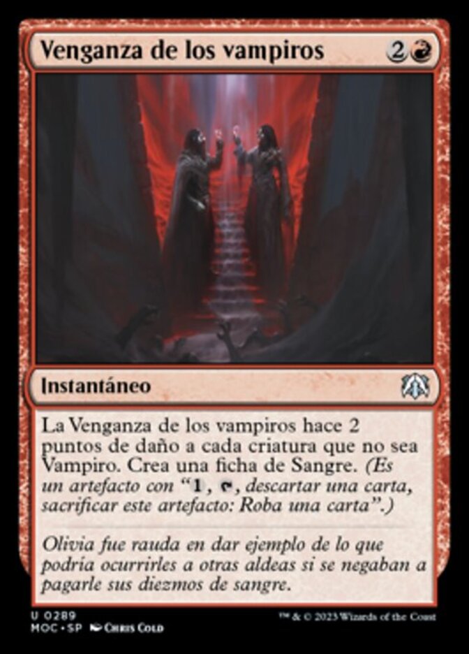 | Rules | Vampires' Vengeance deals 2 damage to each non-Vampire creature. Create a Blood token. (It's an artifact with ", , Discard a card, Sacrifice this artifact: Draw a card.") |
