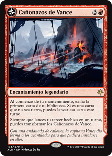 | Rules | At the beginning of your upkeep, exile the top card of your library. If it's a nonland card, you may cast that card this turn. Whenever you cast your third spell in a turn, you may transform Vance's Blasting Cannons. // (Transforms from Vance's Blasting Cannons.) : Add . , : Spitfire Bastion deals 3 damage to any target. |