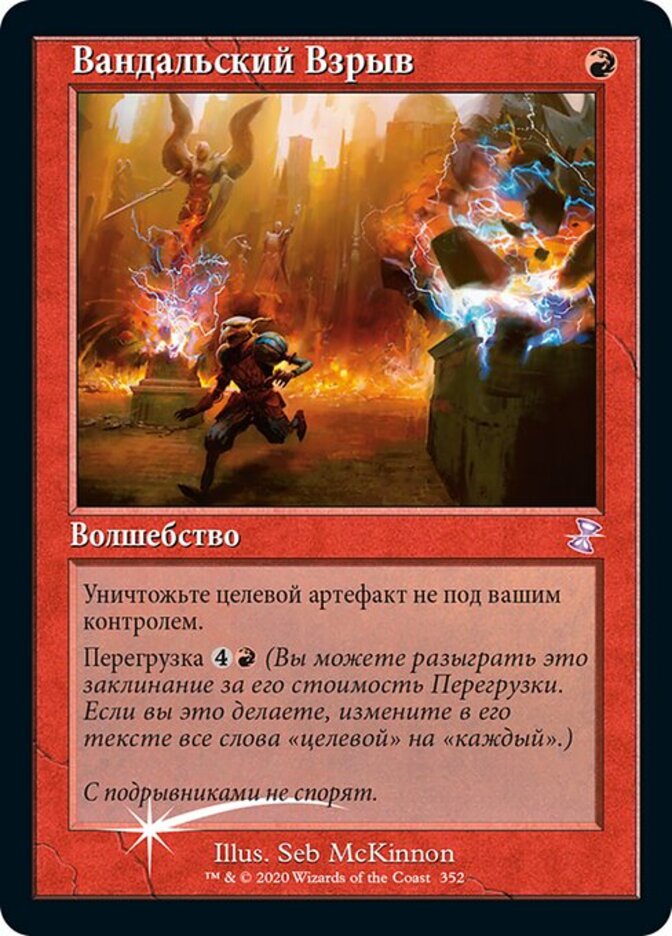 | Rules | Destroy target artifact you don't control. Overload (You may cast this spell for its overload cost. If you do, change its text by replacing all instances of "target" with "each.") |