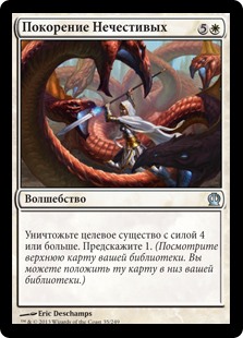 | Rules | Destroy target creature with power 4 or greater. Scry 1. (Look at the top card of your library. You may put that card on the bottom of your library.) |