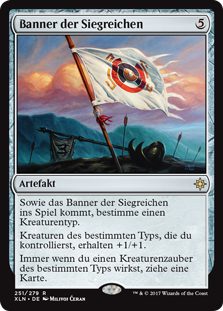 | Rules | As Vanquisher's Banner enters the battlefield, choose a creature type. Creatures you control of the chosen type get +1/+1. Whenever you cast a creature spell of the chosen type, draw a card. |