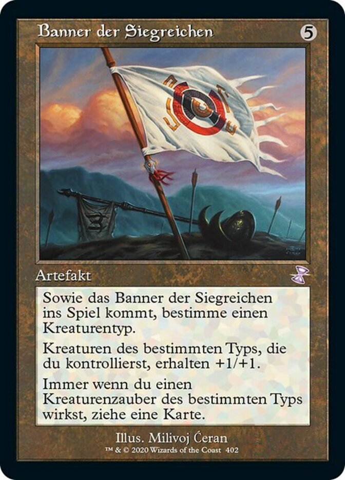 | Rules | As Vanquisher's Banner enters the battlefield, choose a creature type. Creatures you control of the chosen type get +1/+1. Whenever you cast a creature spell of the chosen type, draw a card. |