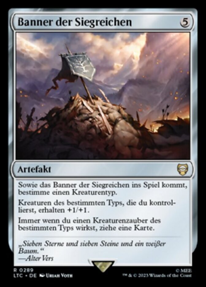 | Rules | As Vanquisher's Banner enters the battlefield, choose a creature type. Creatures you control of the chosen type get +1/+1. Whenever you cast a creature spell of the chosen type, draw a card. |