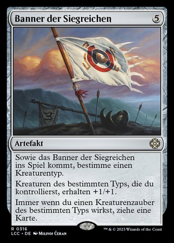 | Rules | As Vanquisher's Banner enters the battlefield, choose a creature type. Creatures you control of the chosen type get +1/+1. Whenever you cast a creature spell of the chosen type, draw a card. |