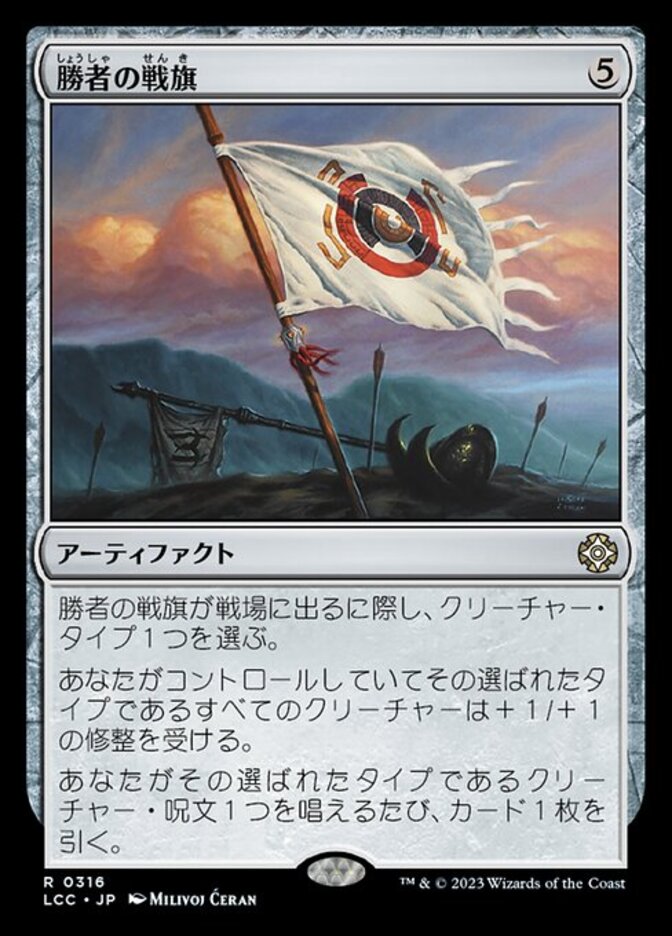 | Rules | As Vanquisher's Banner enters the battlefield, choose a creature type. Creatures you control of the chosen type get +1/+1. Whenever you cast a creature spell of the chosen type, draw a card. |