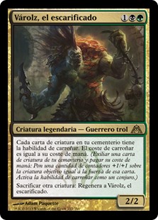 | Rules | Each creature card in your graveyard has scavenge. The scavenge cost is equal to its mana cost. (Exile a creature card from your graveyard and pay its mana cost: Put a number of +1/+1 counters equal to that card's power on target creature. Scavenge only as a sorcery.) Sacrifice another creature: Regenerate Varolz, the Scar-Striped. |