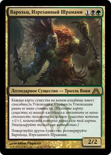 | Rules | Each creature card in your graveyard has scavenge. The scavenge cost is equal to its mana cost. (Exile a creature card from your graveyard and pay its mana cost: Put a number of +1/+1 counters equal to that card's power on target creature. Scavenge only as a sorcery.) Sacrifice another creature: Regenerate Varolz, the Scar-Striped. |