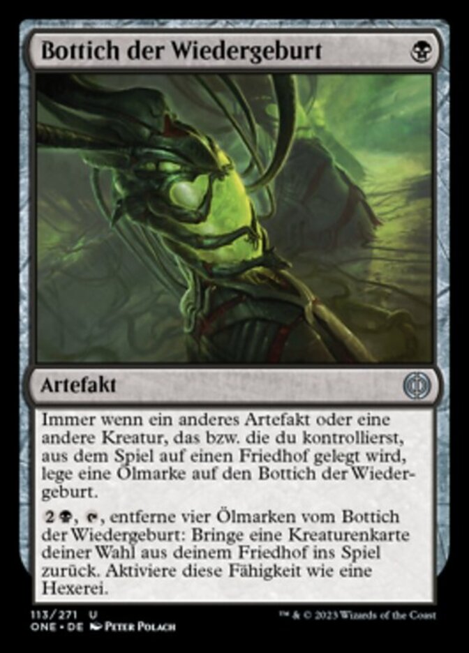 | Rules | Whenever another artifact or creature you control is put into a graveyard from the battlefield, put an oil counter on Vat of Rebirth. , , Remove four oil counters from Vat of Rebirth: Return target creature card from your graveyard to the battlefield. Activate only as a sorcery. |