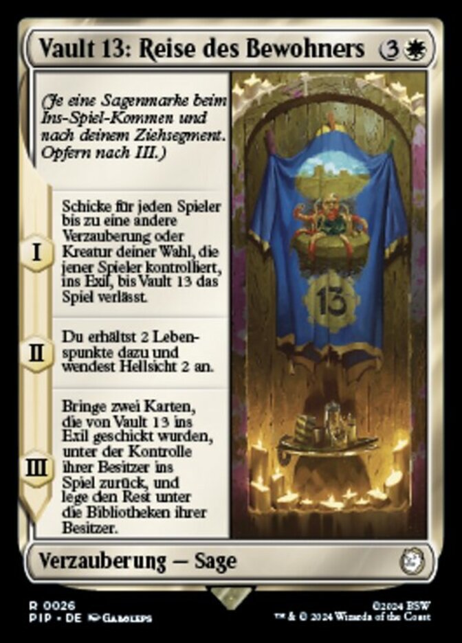 | Rules | (As this Saga enters and after your draw step, add a lore counter. Sacrifice after III.) I — For each player, exile up to one other target enchantment or creature that player controls until Vault 13 leaves the battlefield. II — You gain 2 life and scry 2. III — Return two cards exiled with Vault 13 to the battlefield under their owners' control and put the rest on the bottom of their owners' libraries. |
