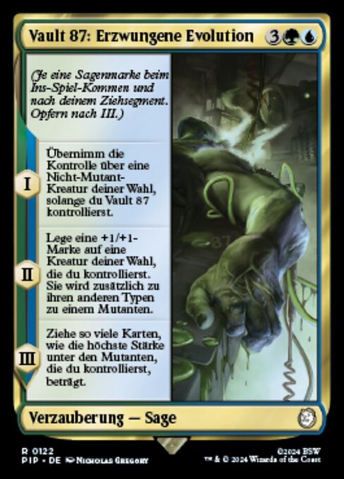 | Rules | (As this Saga enters and after your draw step, add a lore counter. Sacrifice after III.) I — Gain control of target non-Mutant creature for as long as you control Vault 87. II — Put a +1/+1 counter on target creature you control. It becomes a Mutant in addition to its other types. III — Draw cards equal to the greatest power among Mutants you control. |