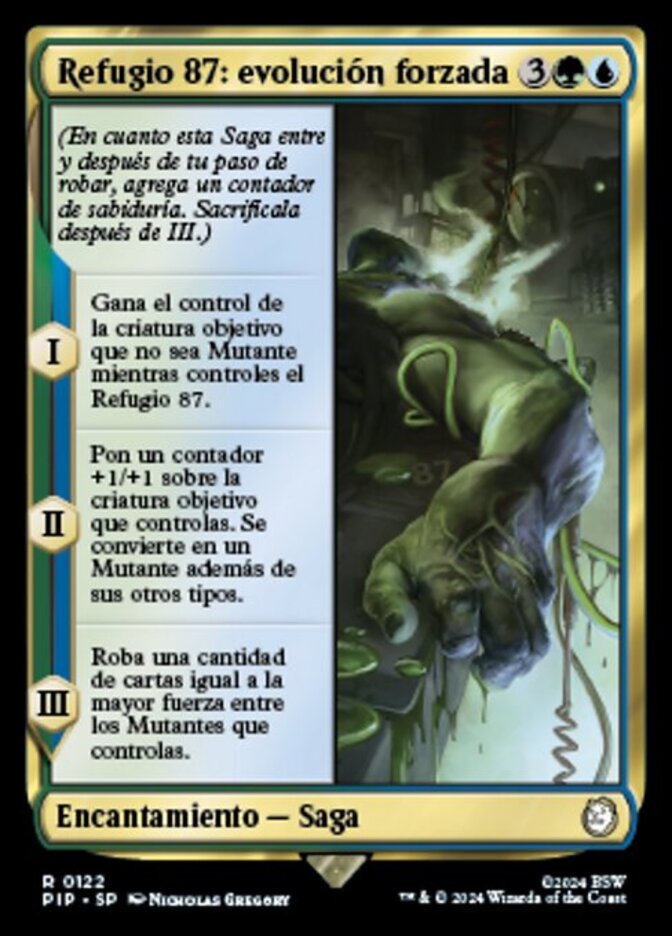 | Rules | (As this Saga enters and after your draw step, add a lore counter. Sacrifice after III.) I — Gain control of target non-Mutant creature for as long as you control Vault 87. II — Put a +1/+1 counter on target creature you control. It becomes a Mutant in addition to its other types. III — Draw cards equal to the greatest power among Mutants you control. |