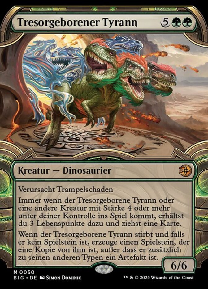 | Rules | Trample Whenever Vaultborn Tyrant or another creature with power 4 or greater enters the battlefield under your control, you gain 3 life and draw a card. When Vaultborn Tyrant dies, if it's not a token, create a token that's a copy of it, except it's an artifact in addition to its other types. |