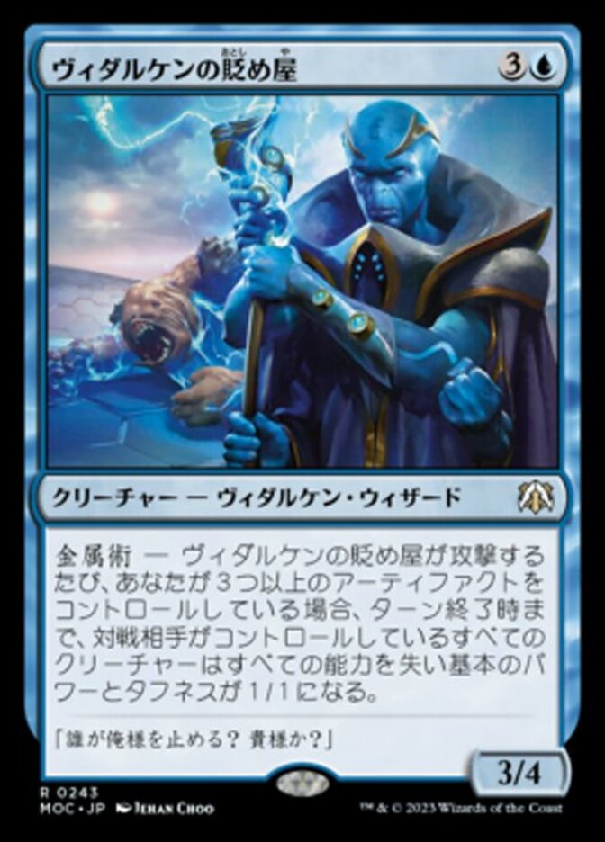 | Rules | Metalcraft — Whenever Vedalken Humiliator attacks, if you control three or more artifacts, creatures your opponents control lose all abilities and have base power and toughness 1/1 until end of turn. |