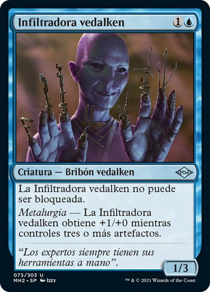 | Rules | Vedalken Infiltrator can't be blocked. Metalcraft — Vedalken Infiltrator gets +1/+0 as long as you control three or more artifacts. |