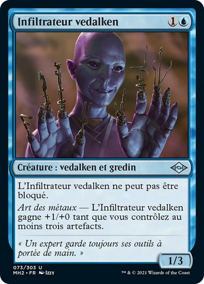 | Rules | Vedalken Infiltrator can't be blocked. Metalcraft — Vedalken Infiltrator gets +1/+0 as long as you control three or more artifacts. |