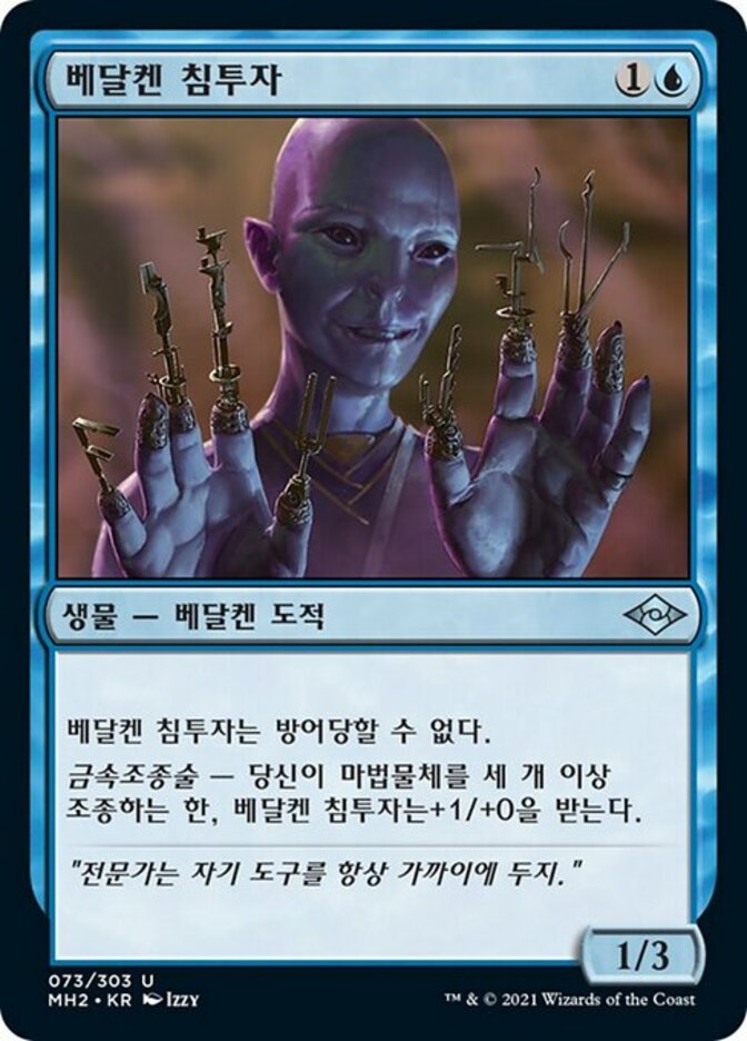 | Rules | Vedalken Infiltrator can't be blocked. Metalcraft — Vedalken Infiltrator gets +1/+0 as long as you control three or more artifacts. |