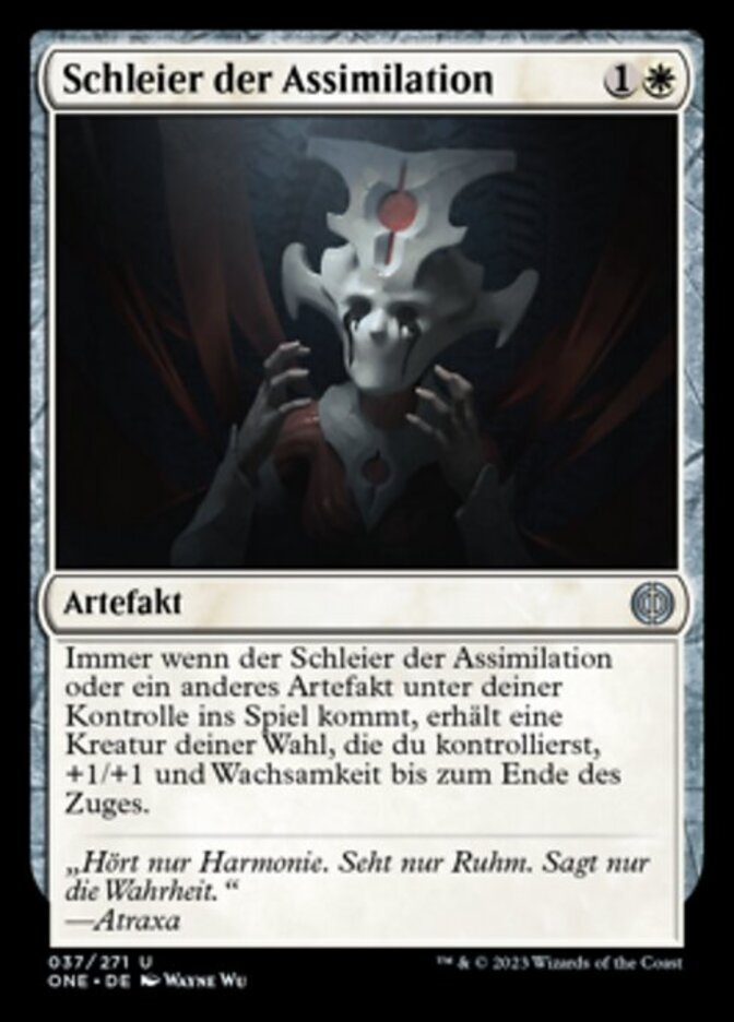 | Rules | Whenever Veil of Assimilation or another artifact enters the battlefield under your control, target creature you control gets +1/+1 and gains vigilance until end of turn. |