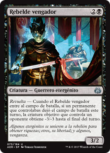 | Rules | Revolt — When Vengeful Rebel enters the battlefield, if a permanent you controlled left the battlefield this turn, target creature an opponent controls gets -3/-3 until end of turn. |