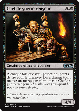 | Rules | Whenever you lose life for the first time each turn, put a +1/+1 counter on Vengeful Warchief. (Damage causes loss of life.) |