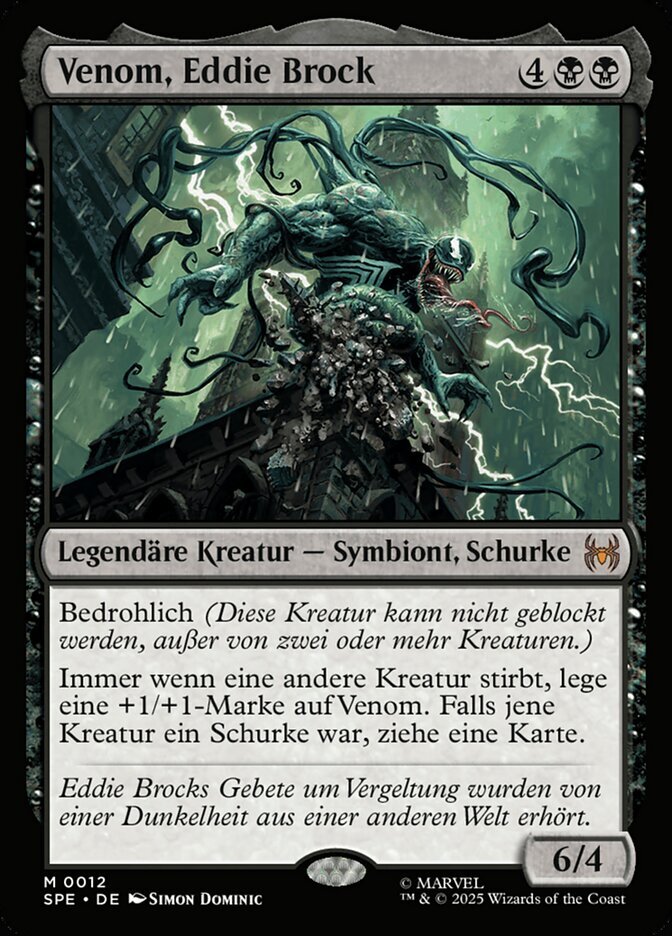 | Rules | Menace (This creature can't be blocked except by two or more creatures.) Whenever another creature dies, put a +1/+1 counter on Venom. If that creature was a Villain, draw a card. |